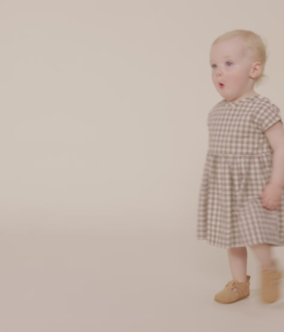 - Short sleeved dress in lightweight, textured seersucker. Button fastening on the shoulders. Very handy for getting baby dressed!